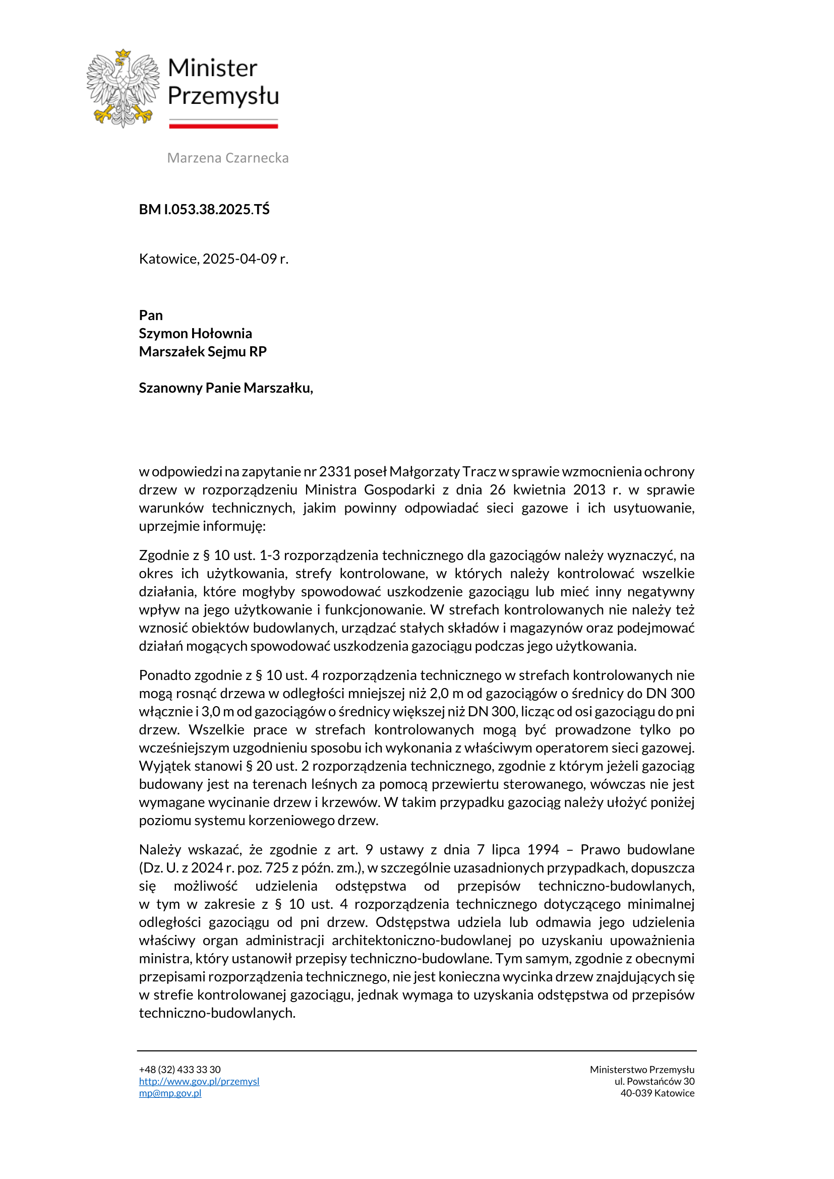 Mając powyższe na uwadze, bardzo proszę na odpowiedź na pytanie, czy Ministerstwo Rozwoju i Technologii rozważyłoby wprowadzenie zmian w Rozporządzeniu Ministra Gospodarki z dnia 26 kwietnia 2013 r. w sprawie warunków technicznych, jakim powinny odpowiadać sieci gazowe i ich usytuowanie (Dz.U. 2013 poz. 640), które pozwoliłyby na zachowanie możliwie maksymalnej liczby drzew w procesach inwestycyjnych związanych z gazociągami na terenach zabudowanych, w sposób analogiczny dla terenów leśnych?