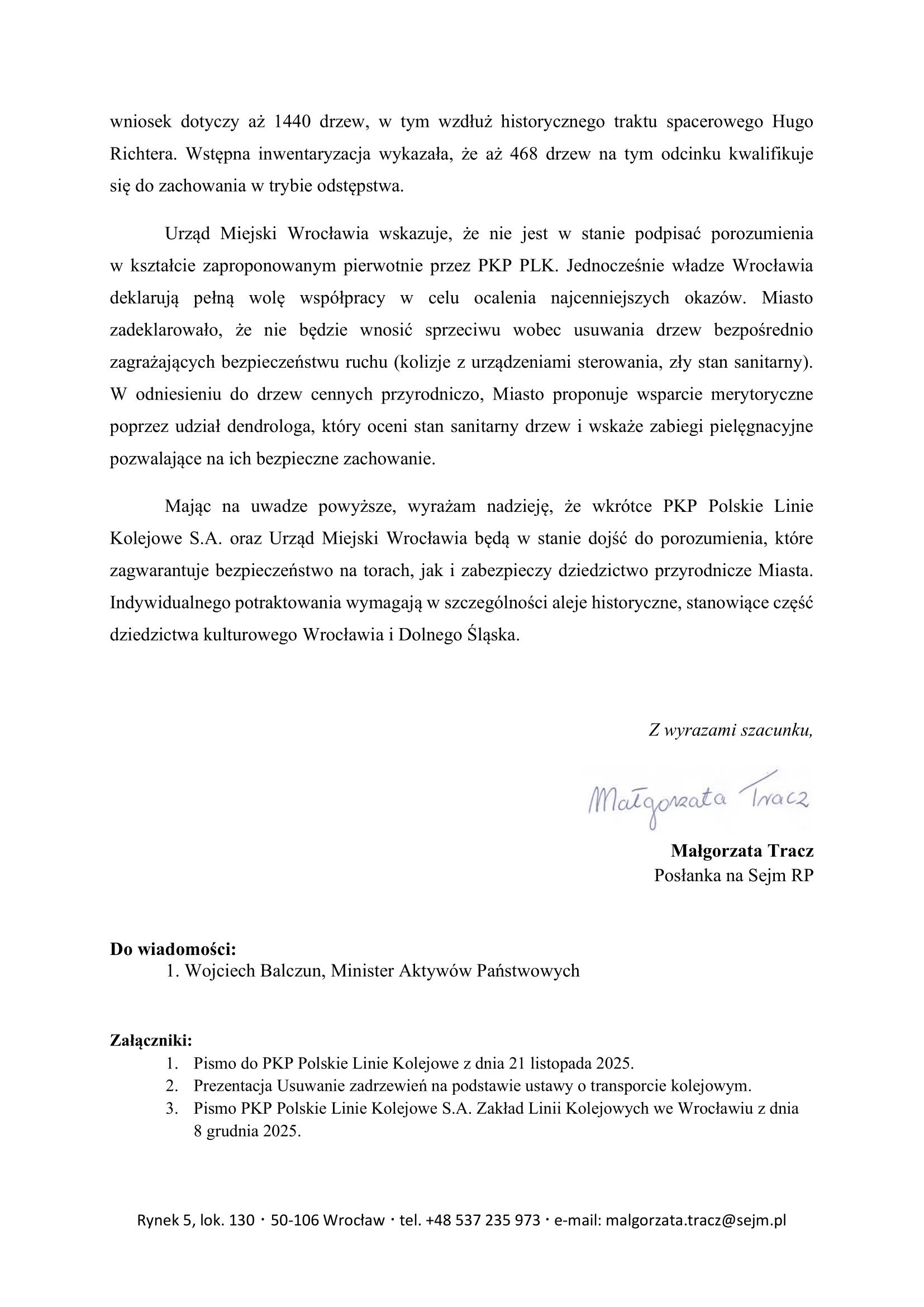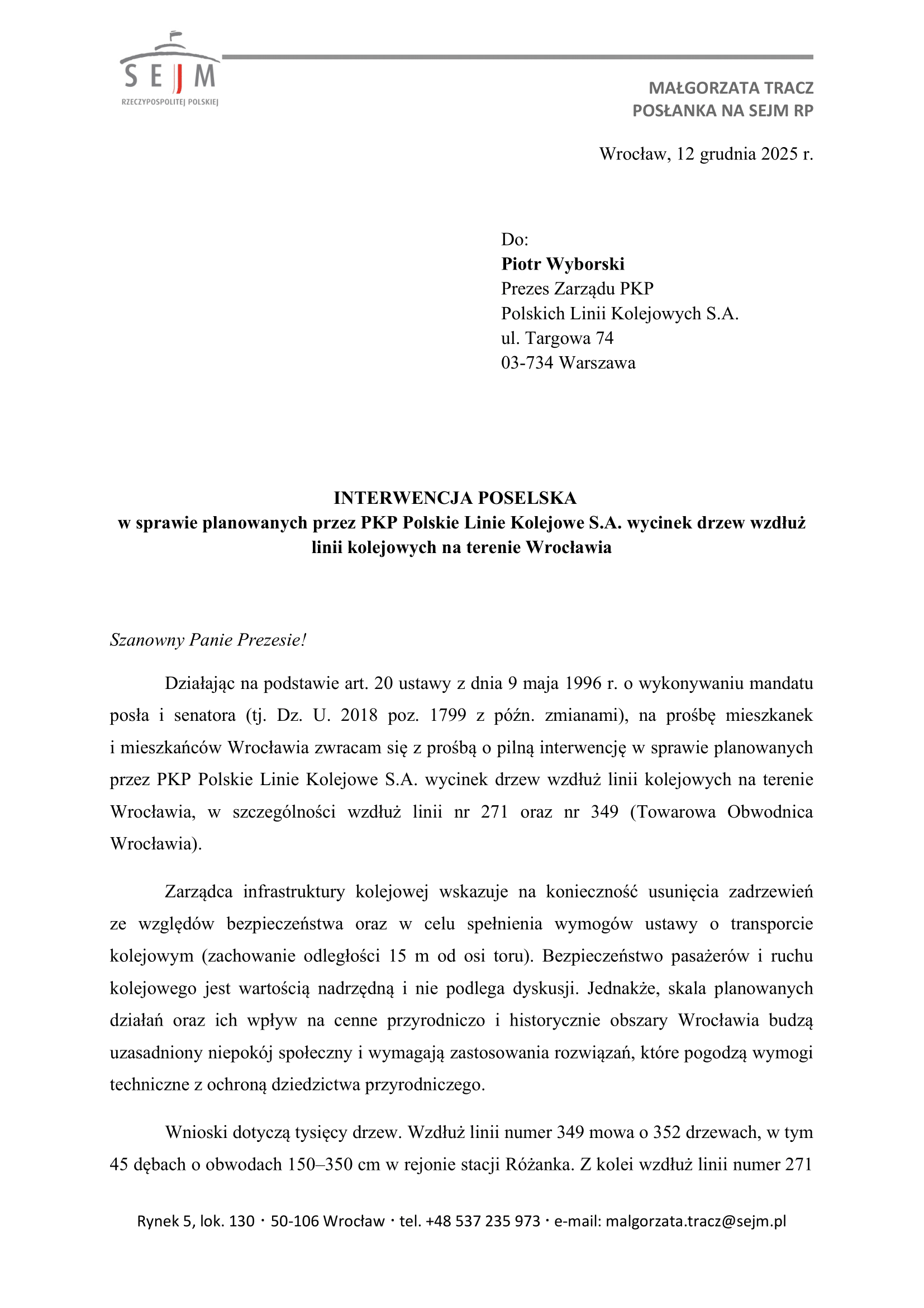 Zwróciłam się z interwencją poselską do Prezesa Zarządu PKP Polskich Linii Kolejowych S.A. w sprawie planowanych przez PKP Polskie Linie Kolejowe S.A. wycinek drzew wzdłuż linii kolejowych na terenie Wrocławia.